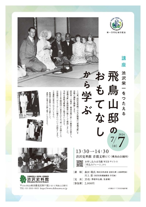 この夏、渋沢史料館では大正建築の「青淵文庫」を会場に講座を開催します。渋沢栄一は東京・飛鳥山邸に多くの賓客をお招きし、「青淵文庫」を接待接客の場として使用しました。今回は虎屋文庫様にご協力をいただき、1905年(明治38)の茶会をはじめ、栄一がお迎えしたお客様や「おもてなし」の様子についてお話をします。